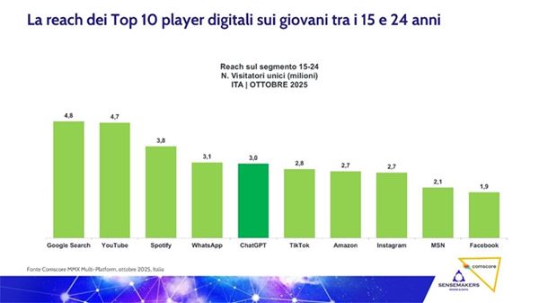 Nella fascia d’età 15-24, il livello di penetrazione dell’applicazione di Open AI sfiora il 50% (49,1%) e ChatGPT, con i suoi 3 milioni, è il quinto player per numero di utilizzatori davanti a TikTok al sesto posto con 2,8 milioni e Instagram all’ottavo con 2,7 milioni. Si tratta di giovani che usano internet più intensamente rispetto alla metà dei loro coetanei che non si avvalgono di ChatGPT soprattutto per la fruizione di contenuti relativi ai servizi finanziari (+31 punti percentuali rispetto alla media del segmento d’età), alla musica (+26 punti percentuali), ai viaggi (+22 punti percentuali).