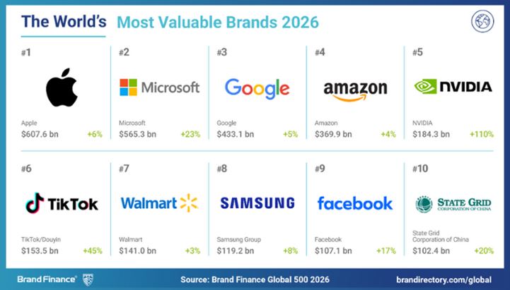 Presentata a Davos in occasione del World Economic Forum 2026, la nuova edizione del Brand Finance Global 500 fotografa un’economia dei marchi sempre più trainata dalla tecnologia e, in particolare, dall’intelligenza artificiale. Nella Top 10 dei brand globali emergono con forza i player legati all’AI, mentre l’automotive registra una battuta d’arresto, con il caso Tesla a fare da spartiacque.