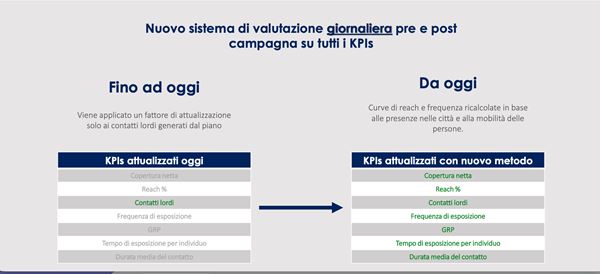 Fino ad oggi la pianificazione puntuale portava a poter calcolare come risultato solo i contatti lordi. Da oggi invece è possibile per i centri media e le aziende avere come ritorno della propria pianificazione i dati giorno per giorno sulle curve di reach e di frequenza di esposizione, comprendendo i risultati di GRP, copertura netta e tempo di esposizione per individuo.