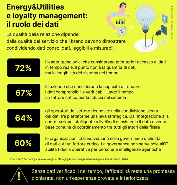 In questo scenario la loyalty assume una forma più strutturata e consapevole. Si consolida quando l’esperienza complessiva che offri risulta coerente, riconoscibile e affidabile nel tempo, e quando le persone scelgono di restare dentro il tuo ecosistema perché trovano orientamento, continuità e valore concreto. Nel settore Energy e Utilities, la fedeltà emerge quando il sistema funziona e rende leggibile la propria evoluzione, accompagnando le scelte quotidiane legate all’energia. È qui che dati, regole e comportamenti operativi diventano veri elementi relazionali, capaci di sostenere fiducia e continuità anche nei processi decisionali automatizzati.
