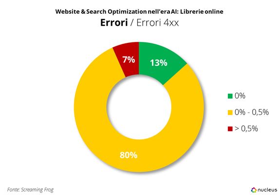 Riguardo agli errori 4xx, si evidenzia come la maggior parte degli e-commerce analizzati presenti un numero limitato di pagine che restituiscono errori di questo tipo. Un solo sito supera la soglia dello 0,5%, mentre soltanto 2 portali non presentano pagine interne con status code 4xx.