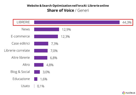 Anche nel caso dei generi letterari e tipologie di libri, i siti di LIBRERIE coprono la maggior parte della visibilità.