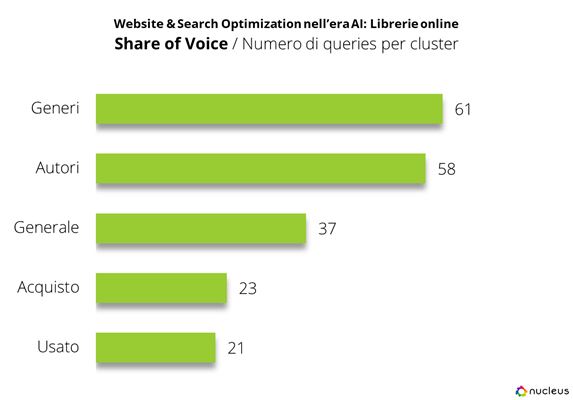 Questo cluster include diverse keyword commerciali importanti per gli e-commerce, dato che sono orientate alle novità, classifiche e offerte di libri. I siti delle LIBRERIE coprono la maggior parte della visibilità, superando ampiamente le altre categorie.