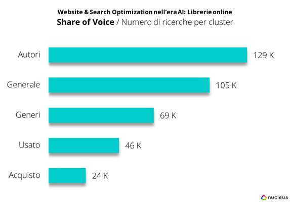 I cluster sono quindi gruppi di termini di ricerca correlati tra loro che si riferiscono a queste aree semantiche. Il primo grafico rappresenta il numero totale di termini di ricerca (o query, o chiavi di ricerca) selezionate per ogni cluster.