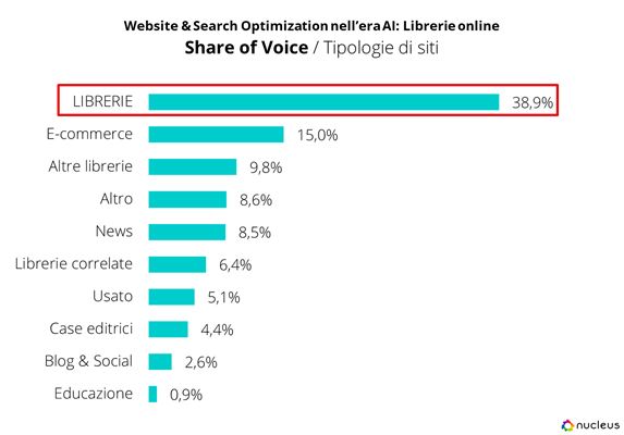 L'analisi è stata condotta considerando i domini precedentemente analizzati e ora classificati come "LIBRERIE" all'interno dello Share of Voice. Oltre a questi, sono state identificate altre tipologie di siti correlati al settore, suddivise in categorie: