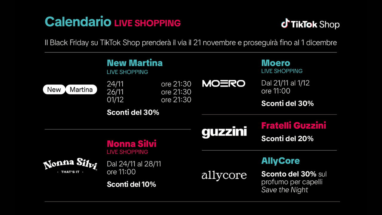 Il Black Friday sulla piattaforma partirà il 21 novembre e durerà fino al 1° dicembre, con una serie di sessioni di Live Shopping dedicate alle promozioni più interessanti. Tra i creator e brand coinvolti ci sono nomi come New Martina, Nonna Silvi e Moero, che guideranno gli utenti nella scoperta dei prodotti e delle offerte in diretta, trasformando la ricerca degli sconti in un vero e proprio spettacolo digitale.