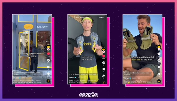 “La partnership con Cosmic permette di comunicare correttamente i valori del brand su un canale ad alta specificità”, spiega Alberto Monti, Global Marketing Art Director di Vibram. “Da quando Vibram ha approcciato strategicamente TikTok, abbiamo verificato un crescita di engagement e un forte interesse sia per il mondo della tecnologia delle suole, e in particolare per la riparazione, che per Vibram FiveFingers”.