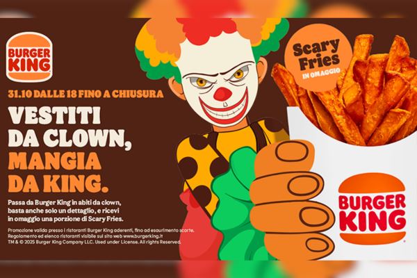 Per Halloween 2025, la strategia combina campagna pubblicitaria integrata, promozioni in-store e attività digitali, con l’obiettivo di portare la “paura… di non riuscire a resistere alla fame”. Protagonista assoluto è il Nightmare Burger, «un panino “da brivido” che unisce hamburger di manzo e pollo fritto. L’offerta si completa con menù cult come il Crazy Cheese BBQ e il Chicken Bacon King a prezzi “fantasmagorici”. Anche i più piccoli trovano spazio nella festa con i King Junior Meal arricchiti da gadget a tema Scooby-Doo, per un Halloween da collezione - ha spiegato la manager -. Il 31 ottobre, dalle 18 fino a chiusura, i ristoranti italiani ospiteranno un’attivazione speciale: chi si presenterà con un travestimento, anche solo un accessorio, da clown riceverà gratuitamente le Scary Fries, patate dolci fritte limited edition, perfette per essere condivise sui social».