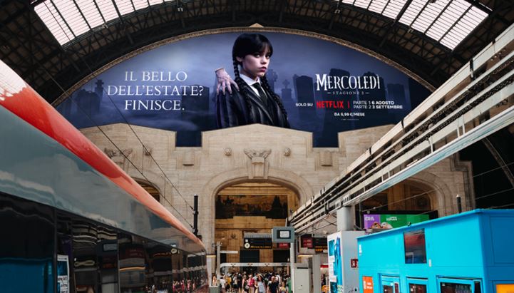 Il progetto, che aveva preso avvio con il lancio della prima parte il 6 agosto, si è sviluppato su più canali, ribaltando con ironia dark i simboli dell’estate italiana. Nella fase iniziale, oltre a una pianificazione OOH in stazioni, autostrade e nell’aeroporto di Roma Fiumicino, erano state previste attivazioni radiofoniche con la voce di Mercoledì (doppiata da Chiara Fabiano), eventi speciali come il Lido Mercoledì a Roma con la presenza di Tim Burton e Ghali, una tappa al Giffoni Film Festival e uno stunt ad Amalfi, dove un pallone aerostatico a forma della protagonista aveva oscurato il cielo della costiera con il claim “Il bello dell’estate? Finisce”.