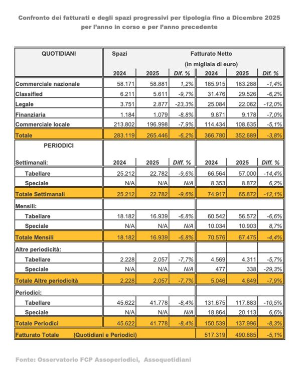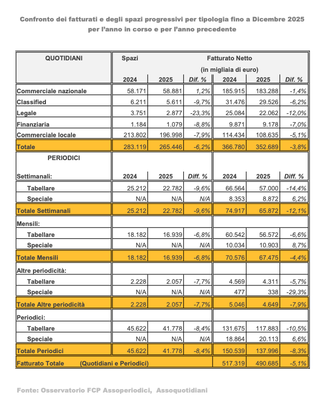 Cala il fatturato pubblicitario del mezzo stampa nei 12 mesi 2025 rispetto al 2024: i dati appena pubblicati dall'Osservatorio Stampa FCP hanno registrato nel periodo Gennaio-Dicembre 2025 un decremento del -5,1% rispetto a un anno fa.