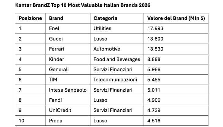 Per la prima volta Enel si aggiudica la prima posizione della classifica italiana con un valore stimato di 18 miliardi di dollari, grazie a una performance in crescita del 17% e all’estensione dell’offerta verso energie rinnovabili e servizi adiacenti come connettività e smart home. Con questo risultato Enel scavalca Gucci, storicamente primo in graduatoria: il marchio del lusso si attesta al secondo posto con 13,8 miliardi di dollari, in un contesto in cui il settore affronta dinamiche di consumo più complesse e mercati internazionali sotto pressione.