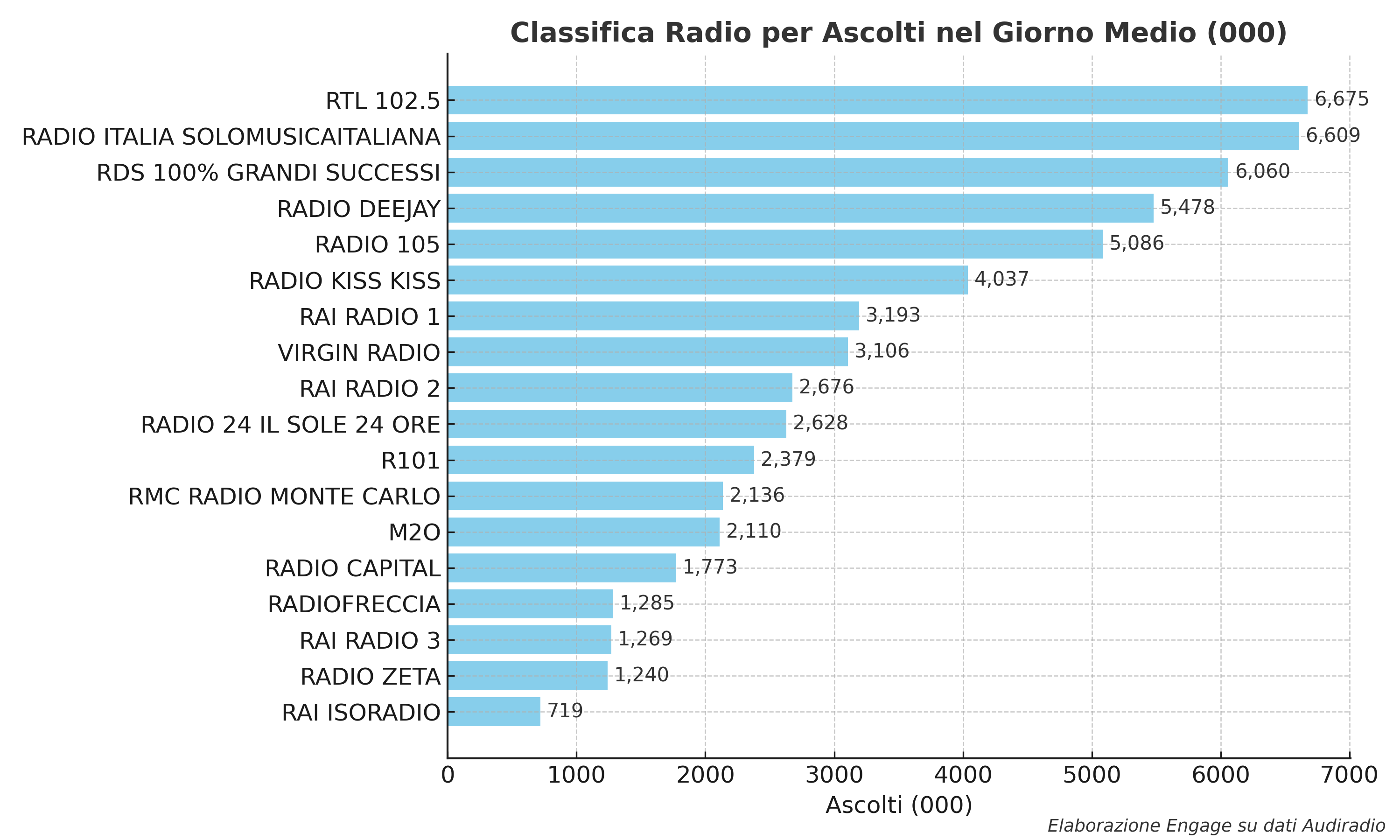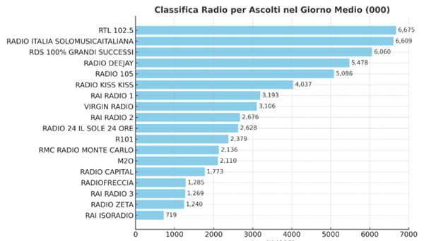 Nel primo semestre del 2025, la radio più ascoltata nel giorno medio si conferma RTL 102.5 con 6,675 milioni di ascoltatori. A brevissima distanza, però, si piazza Radio Italia SoloMusicaItaliana, con 6,609 milioni. Il podio è completato da RDS 100% Grandi Successi, che raggiunge quota 6,060 milioni.