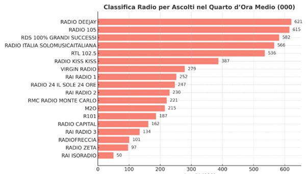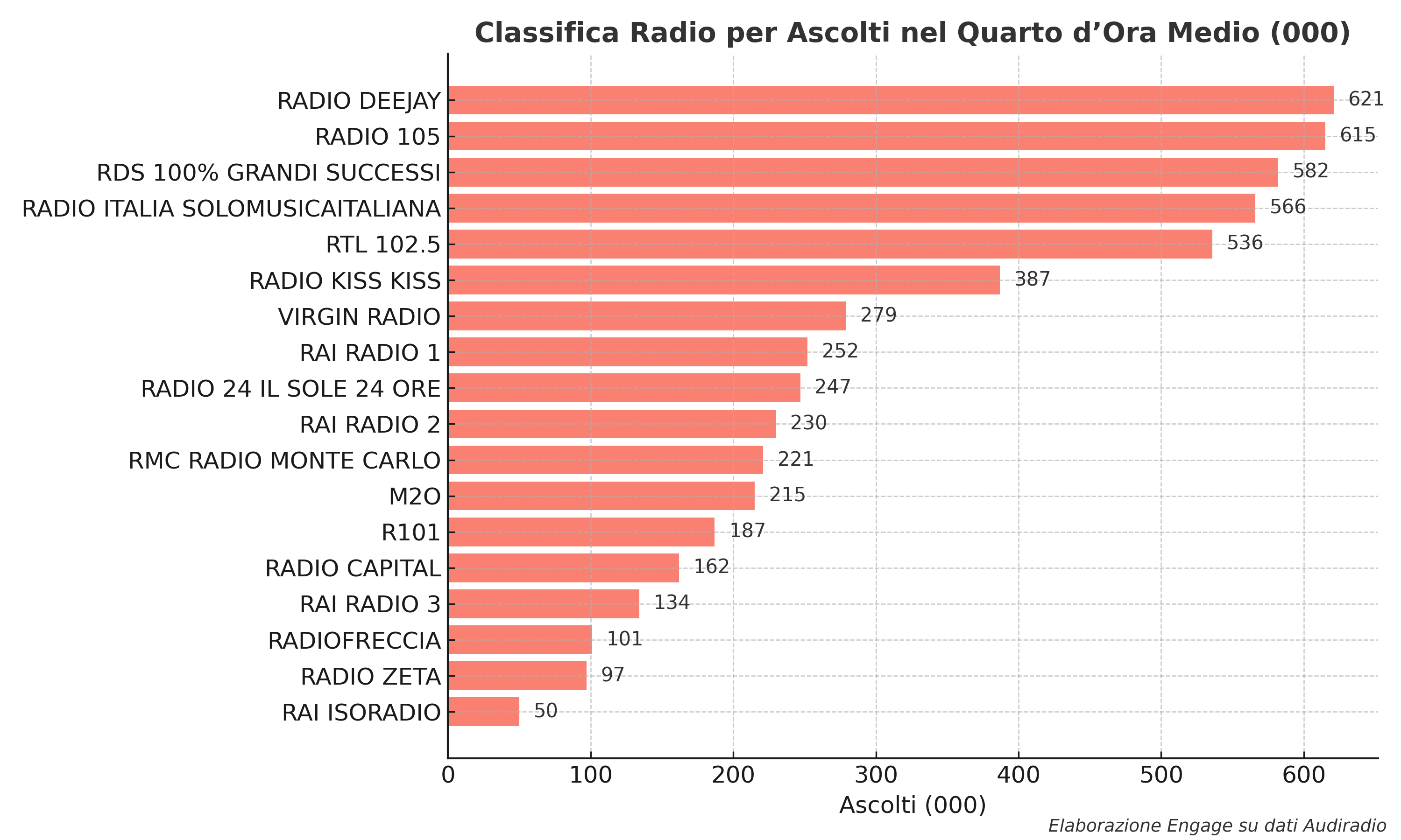 La fotografia cambia se si guarda al quarto d’ora medio (AQH). In questo caso a dominare è Radio Deejay, con 621 mila ascoltatori medi. Al secondo posto, staccata di poco, Radio 105 (615 mila), seguita da RDS (582 mila). Solo quarta Radio Italia (566 mila), mentre RTL 102.5 scende al quinto posto (536 mila), a dimostrazione di un bacino ampio ma distribuito in maniera meno concentrata sul singolo quarto d’ora.