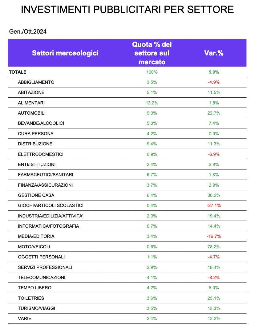 Relativamente ai comparti con la maggiore quota di mercato, si evidenzia, nei primi dieci mesi del 2024, l’andamento positivo di Gestione casa (+30,2%), Automobili (+22,7%) e Distribuzione (+11,3%), in calo invece tra i primi dieci settori Cura Persona (-16,7%) e Telecomunicazioni (-8,2%).