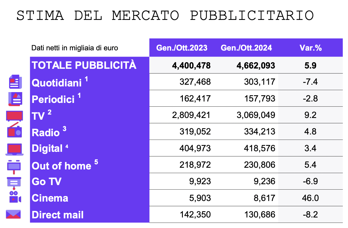 Segno positivo nei primi dieci mesi per l’Out of Home (Transit e Outdoor) che registra un +5,4% e per il Cinema +46%. In calo del 6,9% la Go TV e del 8,2% il Direct Mail.