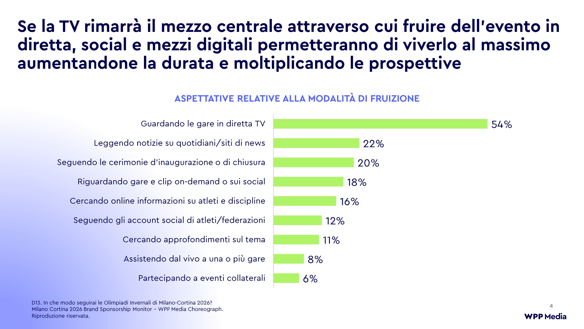 Il pubblico chiede coinvolgimento: il 35% degli italiani si dice più interessato alle storie personali degli atleti che alle performance sportive; il 12% seguirà i Giochi attraverso gli account social degli sportivi, mentre l’8% prevede di assistere dal vivo a gare o eventi collaterali.