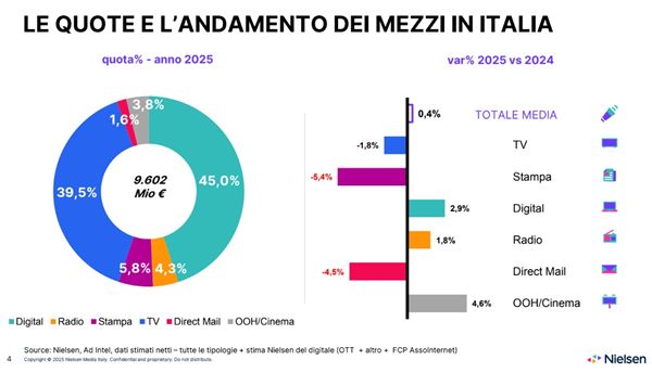 Gli investimenti pubblicitari in Italia sono arrivati a 9,6 miliardi di euro nel 2025 in crescita dello 0,4%, con il mese di dicembre che segna un incremento del +1,1%, secondo i dati di Nielsen AD Intel. Se si esclude dalla raccolta web la stima Nielsen sul search, social, classified (annunci sponsorizzati) e dei cosiddetti “Over The Top” (OTT), l’andamento del 2025 si attesta a -1,6%.