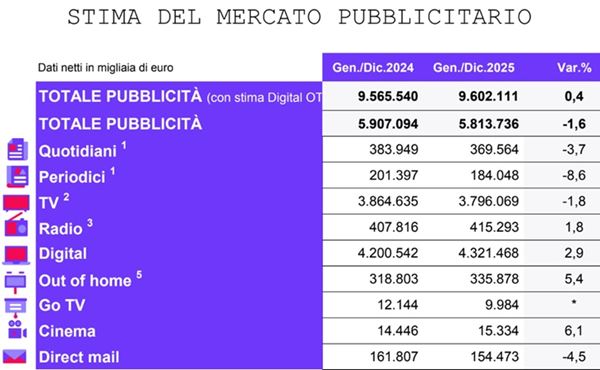 Leggi anche: Pubblicità: investimenti in leggera crescita in Italia a novembre 2025