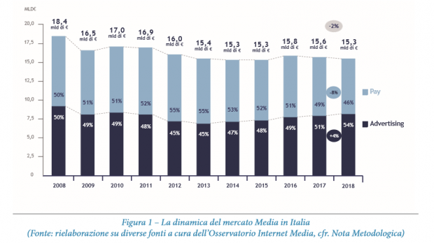 Secondo i risultati emersi dalle ricerche dell'Osservatorio, il mercato dei media in Italia si conferma in flessione: nel 2018 è diminuito del 2% e anche la prima stima per il 2019 traccia un’ulteriore decrescita del 2% che porterà l’intero comparto al di sotto dei 15 miliardi di euro. Il calo è dovuto in larga parte alle componenti Media a pagamento (-8% nel 2018 e in previsione -5% circa anche nel 2019).