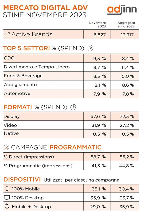 Il mercato della pubblicità digitale mostra, secondo le rilevazione di adjinn, segnali positivi anche nel mese di novembre 2023 nonostante il confronto con un periodo che nel 2022 portava gradatamente ad un mondiale di calcio "anomalo" se non altro per posizionamento stagionale. Si evidenzia, secondo adjinn, una crescita congiunturale (+2,5%) nel numero di marchi - sono 6.827 brand attivi in comunicazione - e un decremento tendenziale (-6,6%) proprio per le ragioni suesposte.