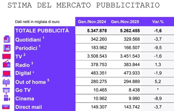 Relativamente ai singoli mezzi, la TV è in calo nel mese di novembre dell'1,7% e dell'1,6% nel periodo gennaio-novembre 2025. I Quotidiani sono in calo a novembre dell'1,5% (periodo gen./nov. 2025 a -3,7%) così come i Periodici che decrescono dell'11,9% (periodo gen./nov. 2025 a -9,5%). In calo anche Radio (-8,4%) a novembre (ma in crescita dell'1,3% negli undici mesi).