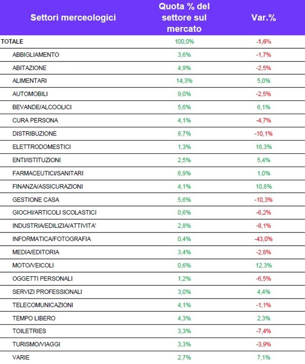 Relativamente ai comparti con la maggiore quota di mercato, si evidenzia, tra gennaio e novembre, l’andamento positivo di Alimentari (+5%), Finanza/Assicurazioni (+10,8%) e Bevande/Alcoolici (+6,1%). In calo invece Distribuzione (-10,1%), Gestione casa (-10,3%) e Automobili (-2,5%).