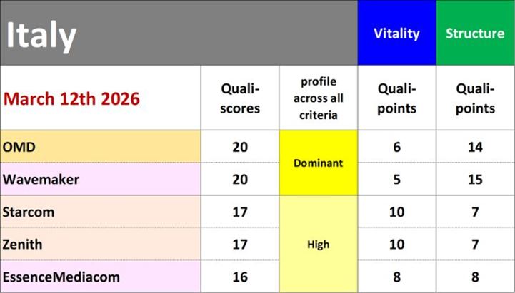 Secondo l’ultima rilevazione, a guidare il ranking qualitativo sono OMD e Wavemaker, entrambe con +20 punti qualitativi. OMD ottiene il punteggio più alto nella competitività nelle gare su un arco di 3 anni, con due voti A+ e un voto B+.