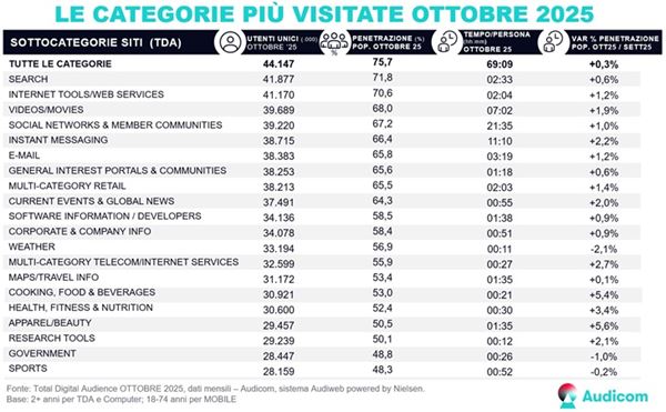 Nel mese di ottobre 2025 sono state 44,1 milioni le persone dai 2 anni in su che hanno navigato da Computer e Mobile (Smartphone e/o Tablet), online per 69 ore complessive, secondo i dati della total digital audience, prodotti dal sistema Audiweb e distribuiti da Audicom.