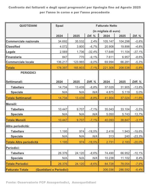 Continua l’andamento negativo della pubblicità sul mezzo stampa. Secondo gli ultimi dati dell’Osservatorio Stampa FCP, nel periodo Gennaio-Agosto 2025 gli investimenti advertising sulla carta stampata hanno visto un decremento del -6,4%.