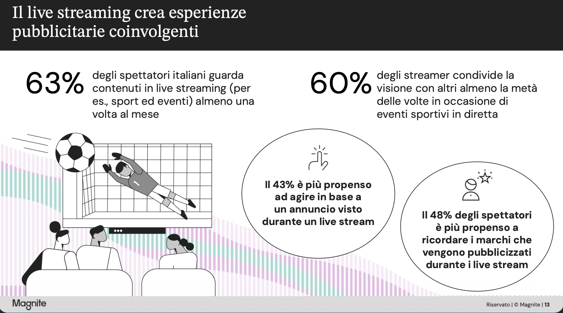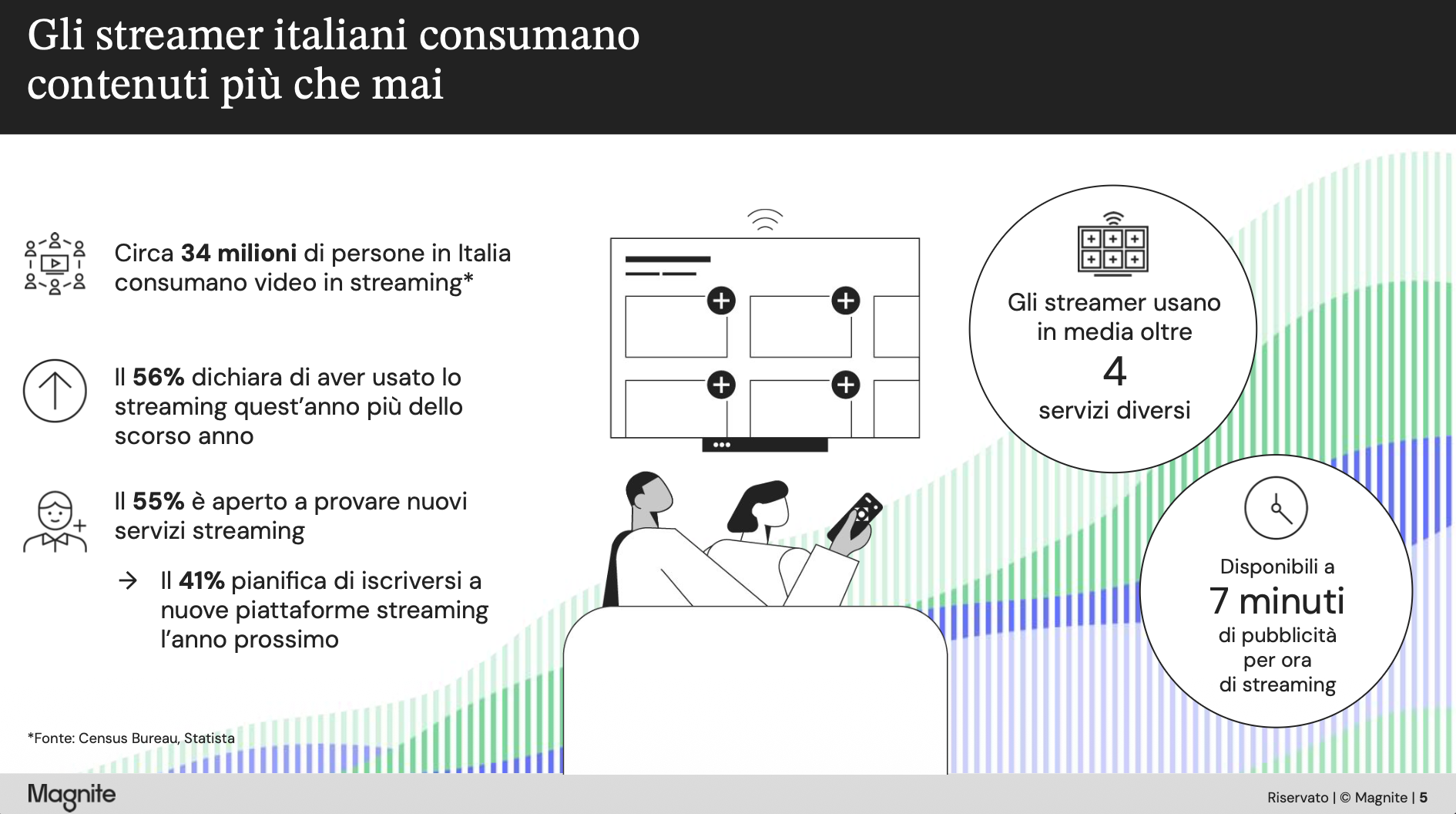“La nostra ricerca Streams and Screens dimostra che lo streaming continua ad accelerare in Italia, offrendo un'importante opportunità alle aziende per connettersi con i consumatori attraverso un canale ad elevato impatto, guidato dai risultati”, commenta Lorenzo Del Seppia, Direttore Commerciale di Magnite per Italia, Spagna e MENA. “Con gli spettatori che abbracciano lo streaming supportato dalla pubblicità, gli inserzionisti possono ora combinare la portata e la potenza della televisione con la precisione e le prestazioni del digital advertising, stimolando sia la consapevolezza che l’azione e rafforzando i messaggi su tutti i dispositivi. È particolarmente efficace nel guidare i consumatori lungo il funnel di acquisto”.