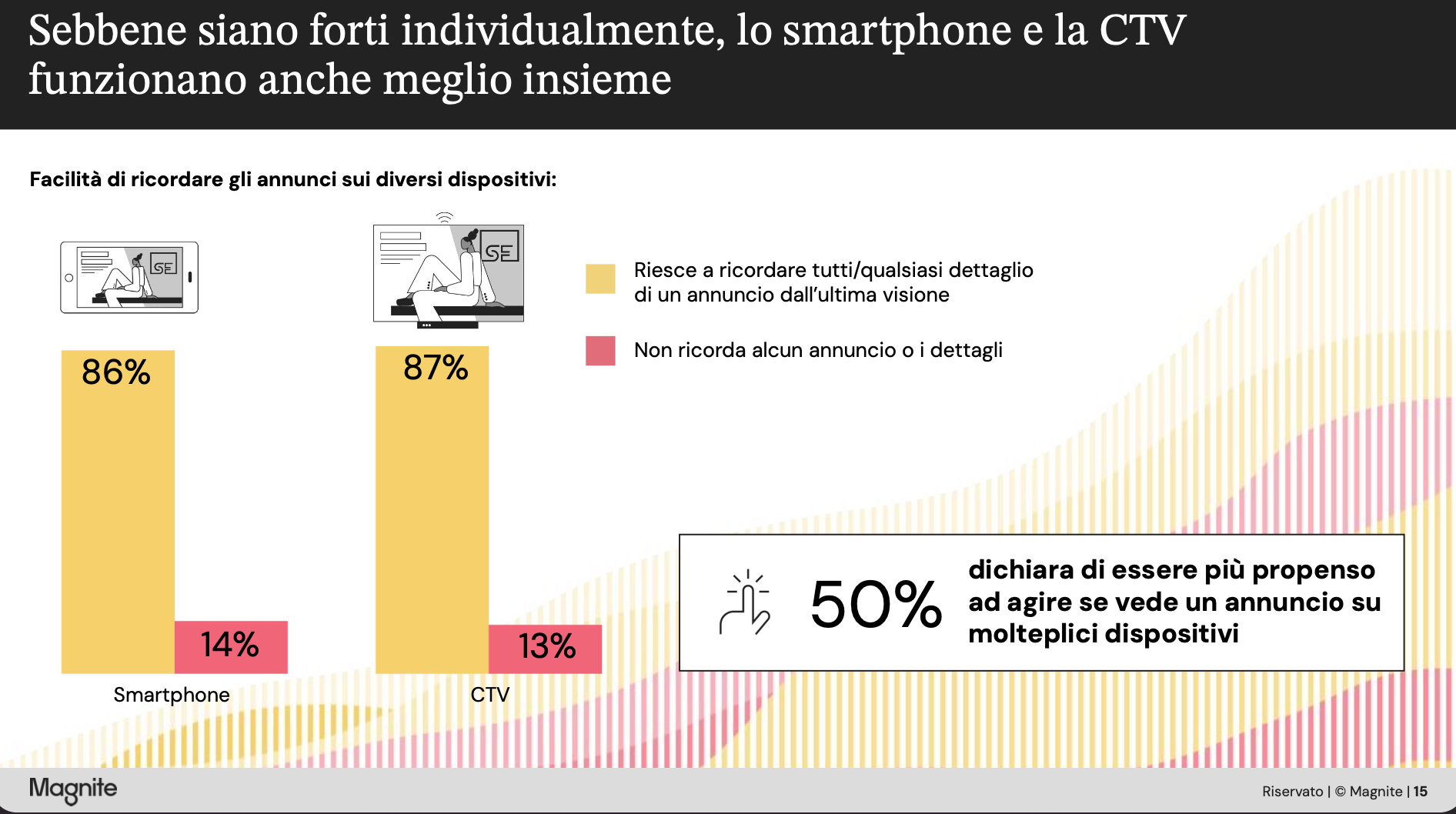 Queste informazioni indicano chiare opportunità strategiche per gli inserzionisti. Una chiave per il successo è quella di produrre campagne coordinate su CTV e mobile per estendere la portata, rinforzare i messaggi lungo tutto il percorso del consumatore e stimolare le conversioni in modo più efficace. Il 50% dei rispondenti, infatti, dichiara di essere più propenso ad agire se vede un annuncio su molteplici dispositivi.