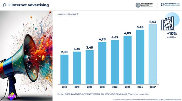 La pubblicità digitale chiuderà l’anno in crescita del 10% a quota 6,03 miliardi di euro, nell’ambito di un mercato advertising che complessivamente raggiungerà gli 11,6 miliardi di euro (circa +5%). Lo ha detto dal palco di Intersections, l'evento organizzato da IAB Italia, UNA, ADCI e UPA (a cui dal prossimo anno si unirà Assirm), Andrea Lamperti, Senior Advisor dell’Osservatorio Internet Media del Politecnico di Milano.