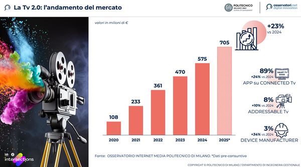 Il digital advertising è trainato dallo sprint della cosiddetta TV 2.0, «che registra una raccolta di 705 milioni di euro, in aumento del 23%, con più del 10% del totale della pubblicità digitale».