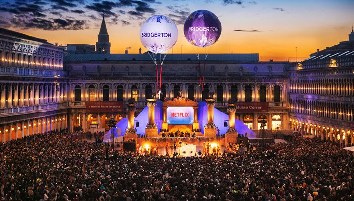 Il 1° febbraio 2026 Piazza San Marco si è trasformata in “un grande palcoscenico a cielo aperto” per l’apertura del Carnevale, con una performance aerea ispirata alla storia di Benedict e Sophie, protagonisti della nuova stagione di Bridgerton ora disponibile su Netflix, un gran ballo aperto al pubblico, l’orchestra We.ensemble e un’esibizione di ballerini professionisti. Secondo le stime diffuse dalla piattaforma, in piazza erano presenti oltre 20mila persone, in un evento che ha portato per la prima volta un ballo “aperto ai fan” nel programma ufficiale del Carnevale.