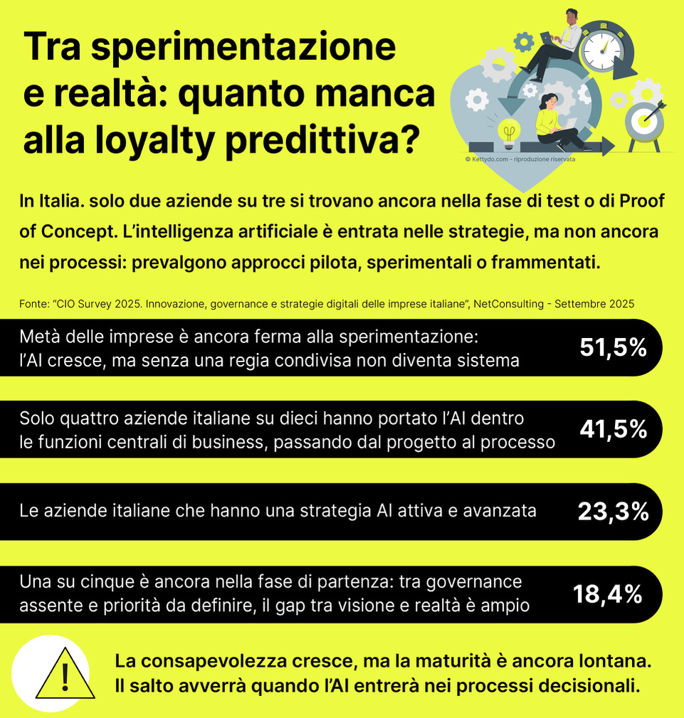 La fotografia degli analisti è quella di un Paese che ha capito l’urgenza dell’AI, ma non ha ancora trovato la formula per innestarla in modo funzionale nei processi di loyalty. La consapevolezza cresce, ma la maturità è ancora lontana. Il salto avverrà solo quando l’AI entrerà nei processi decisionali