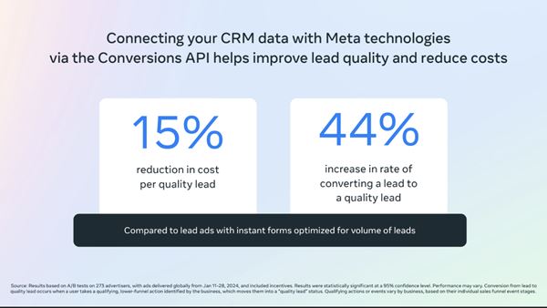 La novità più importante e più promettente consiste però nell’utilizzo dell'intelligenza artificiale (AI) per ottimizzare le campagne con l’obiettivo di qualità delle lead, sfruttando a questo scopo i dati di prima parte delle aziende. Grazie all’integrazione tra Meta e i sistemi CRM delle aziende, possibile con la soluzione Conversions API di Meta, è ora possibile ottimizzare le campagne per generare contatti di qualità superiore, vale a dire contatti che si convertono effettivamente in chiamate, appuntamenti e vendite.