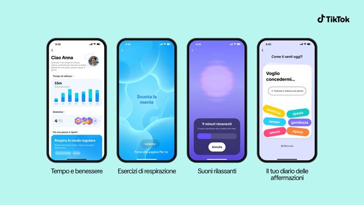 Nel primo gruppo, la principale novità è "Tempo e Benessere", un nuovo spazio in app con nuovi strumenti per aiutare le persone a rilassarsi e sviluppare abitudini digitali consapevoli, tra cui un diario di affermazioni positive, un generatore di suoni rilassanti ed esercizi di respirazione. La funzione raccoglie anche video di creator che offrono consigli pratici su come utilizzare al meglio gli strumenti di sicurezza e benessere di TikTok, e include quattro nuove "Attività", progettate per aiutare gli utenti a sviluppare abitudini digitali equilibrate nel lungo periodo completando azioni che rafforzano comportamenti consapevoli.